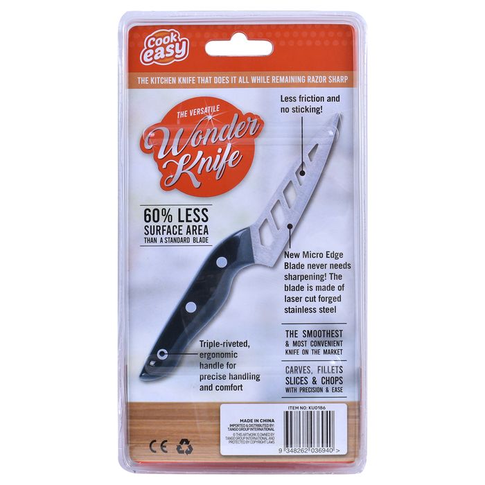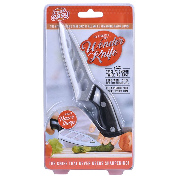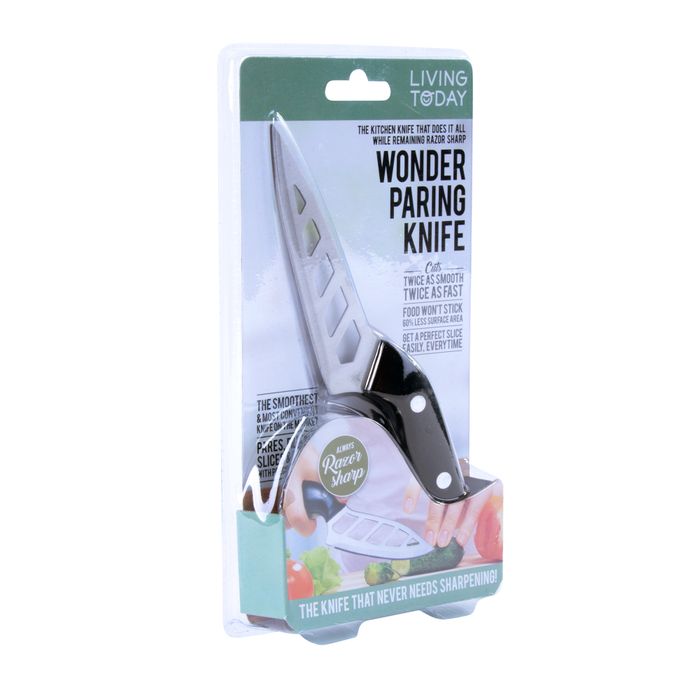 Wonder Paring Knife makes trimming vegetables and peeling fruit a breeze! Tired of struggling with dull knives that barely even work? Introducing the As Seen On TV Wonder Paring Knife, the perfect companion to our best selling Wonder Cook's knife. This versatile kitchen knife is designed to do it all, and is guaranteed to stay razor sharp for life! The secret is the aerodynamic design that creates less friction when you slice, so foods don't stick for perfect, clean cuts every time! This makes the Wonder Knife the easiest and smoothest paring knife in your kitchen drawer. The Wonder paring knife is so universal and easy to use - great for all those tricky jobs in the kitchen. Features & Benefits - food never sticks to the Wonder paring knife. Super tough and sharp, the Wonder paring knife is made of laser cut forged stainless steel. The Wonder knife trademark blade holes gives it 60% less surface area than an ordinary knife which eliminates "food drag". The Wonder paring knife is light as air and easy to handle. The Wonder paring knife has a 10cm angle-grind blade which makes it perfect for all those fiddly jobs. How should I clean my Wonder paring knife? We recommend that you wash and dry the Wonder paring knife immediately after use. Prolonged exposure to acidic substances (i.e. tomato and lemon) can damage even the most high quality knives over time. While you can clean your Wonder Knife in the dishwasher, we recommend that you hand wash and dry this product in order to prevent banging damage to the blade, and to retain the lustre of the product for its full life. Material: stainless steel + ABS.