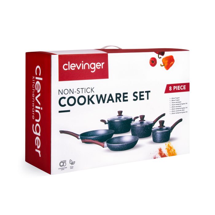 Features - Heavy guage forged aluminium bodies - PFOA free - 4 layer non-stick marble coating for durability & superior food release - Suitable for all cooktop types - Ergonomic wooden look soft touch handles Included 1 x 24cm frypan - 24 x 5cm 1 x 28cm frypan - 28 x 5cm 1 x 16cm saucepan and lid - 16 x 7.5cm 1 x 20cm saucapan and lid - 20 x 9cm 1 x 24cm casserole dish and lid - 24 x 10.5cm The Clevinger range has been hand selected to provide a complete category solution in non-stick cookware. We have several price points considered and bring all the newest technologies to the market in our range. All Clevinger cookware products are constructed using quality materials and workmanship, and our functionality is second to none. Our range is suitable for all cooktop types including, electric, gas, ceramic, halogen and induction. All Clevinger cookware is dishwasher safe meaning no soaking required, so not only will your cooking be top class and your food less likely to burn, you’ll also save time not having to do the dishes after each meal. It’s a win-win scenario, really!
