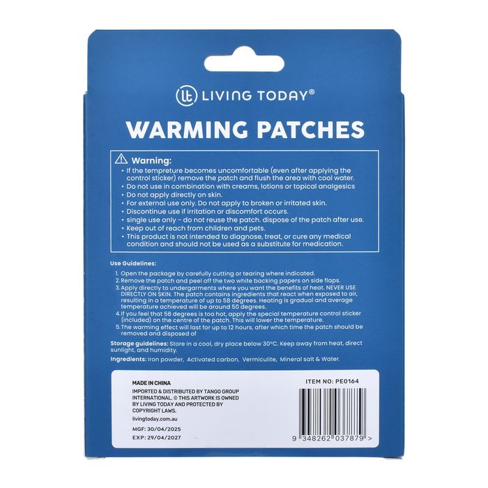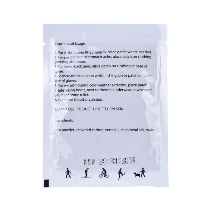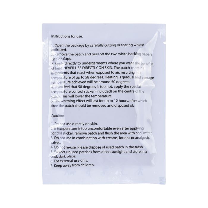 These patches will self-heat up to 58 degrees Celsius once opened, so should NEVER be applied directly to the skin. Instead, stick the two adhesive side flaps to your clothes to allow the benefits of heat to safely warm through. Helpful in alleviating arthritis, lower-back pain, period pain, stomach ache and rheumatism. Also great for fishing, hiking, skiing or any outdoor activity where you need a bit of warmth. The non-woven fabric will not leak and has high air permeability, meaning the heating process is not activated until the outer pack is opened and exposed to oxygen. This process will continue for up to 8 hours, after which it can be safely disposed.