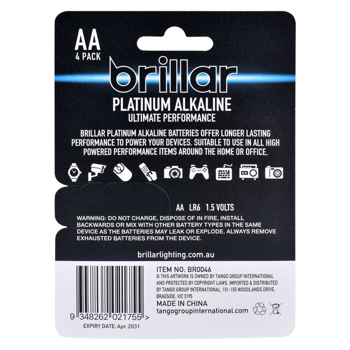 Brillar platinum alkaline batteries offer longer lasting performance to power your devices. Suitable to use in all high powered performance items around the home or office. • AA LR6 1.5 volts • Mercury and Cadmium free • 4 pack