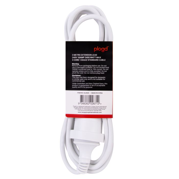 This extension lead is ideal for getting power where you need it. Suitable for all domestic indoor uses. 3 metre length 240V 10amp 2400 watt max