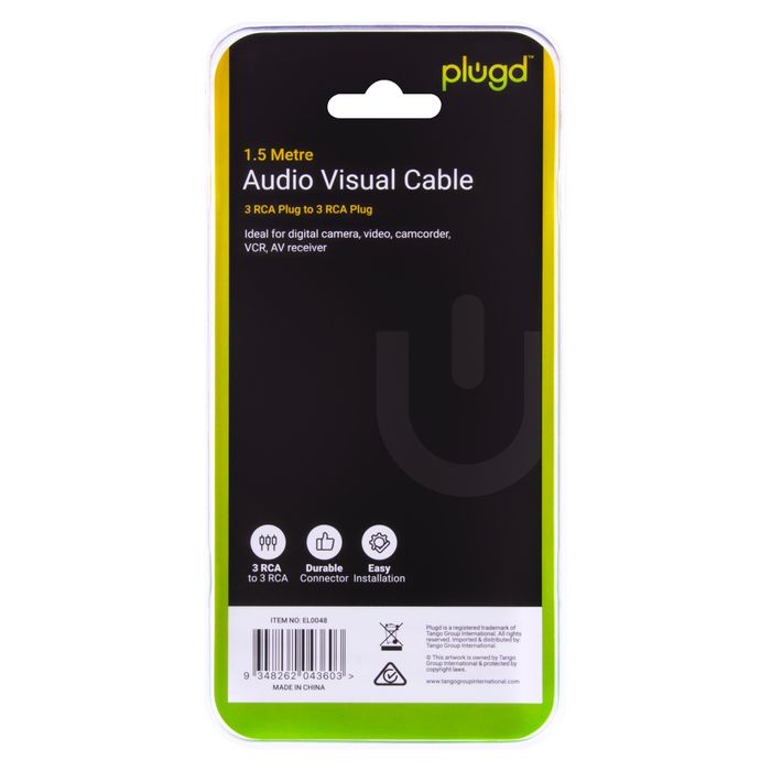 Audio Visual Cable 1.5M. 3 RCA pluig to 3 RCA plug. Gold Plated for durability. Oxygen Free Copper lead. Ideal for Digital Camera, video, camcorder, VCR, AV receiver.