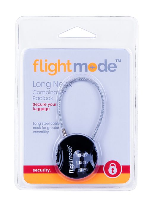 Versatile and flexible combination padlock for luggage with a reliable 3 dial design. No keys to lose, easy to set using a code of your choice. - Deter would-be bag thefts with brutalist composition - Solid 8mm compact case construction - Lightweight 30gm body while still resistant to bag tampering - Fits most bag and luggage zippers - Ideal for; luggage, zippered bags, backpacks, overnight bags, and lockers - Carry-on compliant design - Set your own personal lock combination - Key free lock, no keys to lose and no key holes to be picked Size: Material: Colours: Packaging: Instructions Place the lock so the flightmode logo is facing towards you. The locks default combination is 0-0-0. Align the default combination with the engraved vertical line on the front of the lock. Make sure to accurately align the combination, as a small error will result in the lock not being able to be opened. Squeeze the sides of the lock and the cable will be released, a small tug might be required simultaneously. To reset the default combination, first, open the lock. Use a paperclip or pen tip to press the button on the base of the lock, continue to hold the button and turn the dials to a new combination. Release the button and the lock's combination is now set to your own personalised combination. Please make sure to remember your new combination as there is no way to reset the lock if the combination is forgotten.