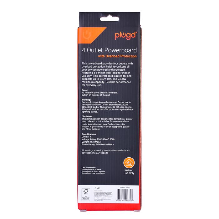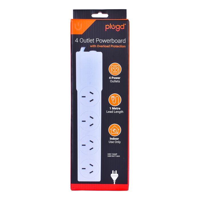 4 Outlet Powerboard with built in circuit breaker ensures your devices remain protected when plugged in. Suitable for home and office use. 4 outlets 1 metre lead length 240V 10amp 2400 watt max