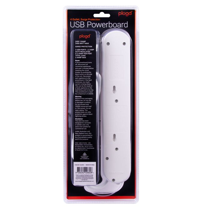 4 Outlet Powerboard with Surge Protection ensures your devices remain protected when plugged in. 2 USB charge ports to keep your small devices powered. Suitable for indoor use only. 4 outlets 2 USB charge ports 0-2.4amp per port 1 metre lead length Surge Protected 240V 10amp 2400 watt max