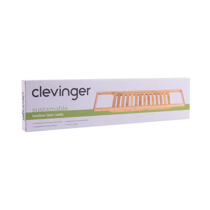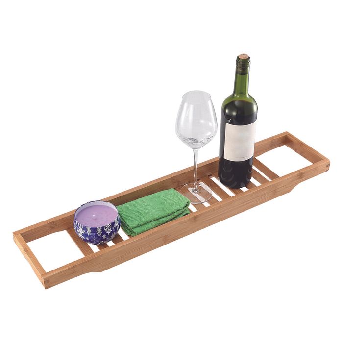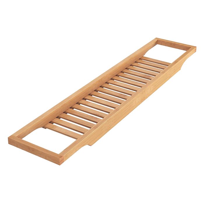 Bamboo bathroom caddy Grated design for easy drainage Ideal for organising the bathroom toiletries you use when bathing Fits neatly on the edges of the bath Material: 100% Bamboo Dimensions:64x15x3.5cm