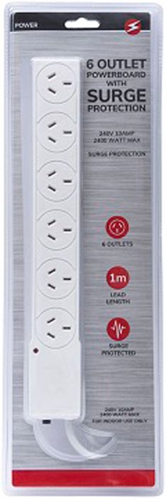 6 Outlet Powerboard with Surge Protection is perfect for the home or office. Suitable for indoor use only. 6 outlets 1 metre lead length Surge Protected 240V 10amp 2400 watt max