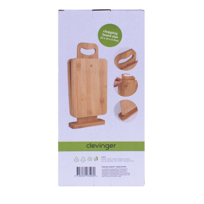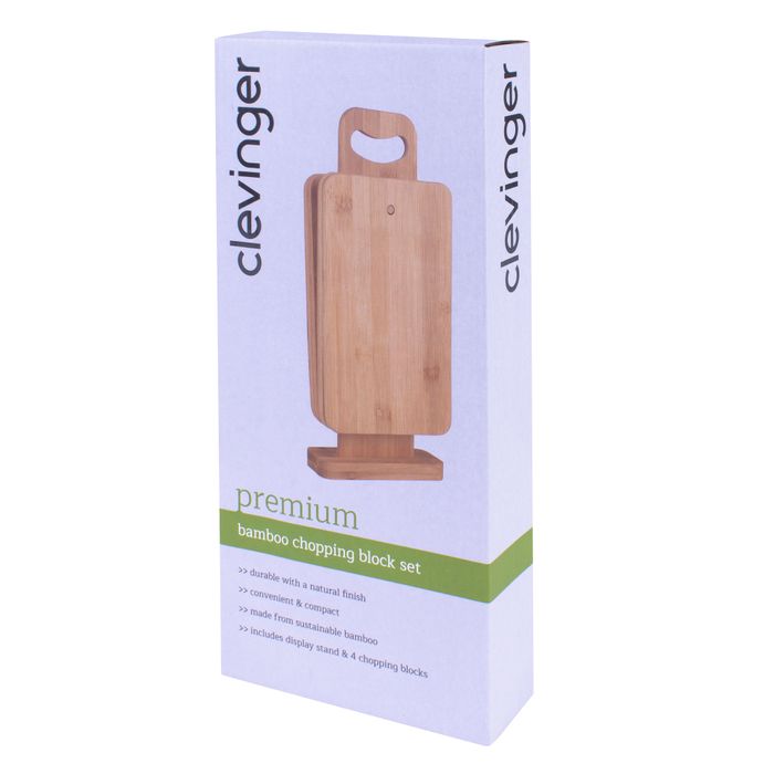 High quality bamboo multi purpose chopping boards with a natural finish Set consists of 1 board stand and 4 bamboo chopping boards Product Size: chopping board: 22x14x0.9cm display stand: 14x32x4.7cm Product Weight :870g Material: 100% Bamboo