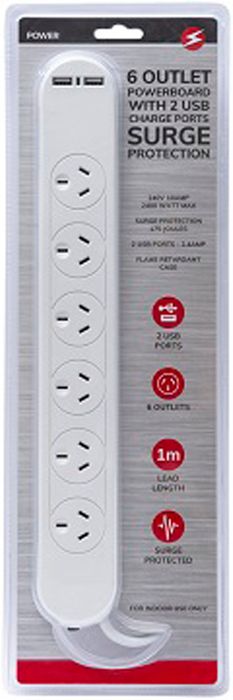 6 Outlet Powerboard with Surge Protection ensures your devices remain protected when plugged in. 2 USB charge ports to keep your small devices powered. Suitable for indoor use only. 4 outlets 2 USB charge ports 0-2.4amp per port 1 metre lead length Surge Protection - 175 joules Flame retardant case 240V 10amp 2400 watt max