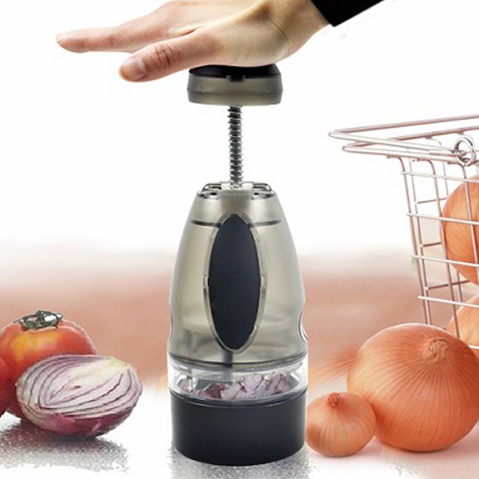 Chop vegetables, nuts, chocolate and fruits quickly and easily. Rotating stainless steel blades are very sharp. Never need to switch blades, durable for use. Open up for easy cleaning and it's safe for dishwasher. * Great for onions and even garlic so that your fingers would not have any odours and it saves time. * Separate outer skin from onions and garlic. * The more you slap, the finer the food. Specifications: Color: Black Material: Stainless Steel + Environmental Plastic Unit dimensions: 8.5x8.5x26cm Package dimension: 9.8*9.8*27cm Package weight: 0.385kg Note: * the blades are very sharp. Please be careful when you are disassembling and cleaning the blades!