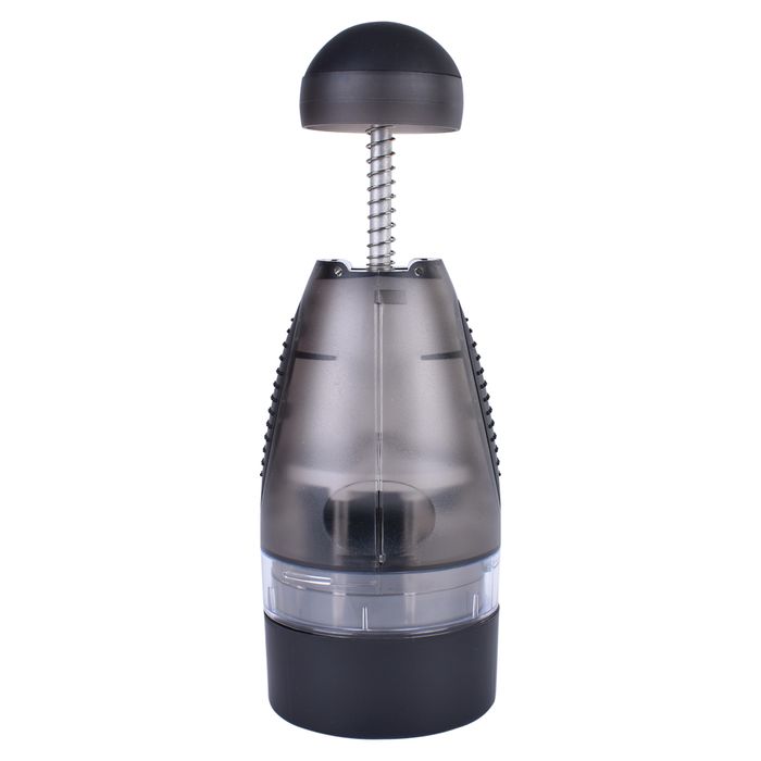 Chop vegetables, nuts, chocolate and fruits quickly and easily. Rotating stainless steel blades are very sharp. Never need to switch blades, durable for use. Open up for easy cleaning and it's safe for dishwasher. * Great for onions and even garlic so that your fingers would not have any odours and it saves time. * Separate outer skin from onions and garlic. * The more you slap, the finer the food. Specifications: Color: Black Material: Stainless Steel + Environmental Plastic Unit dimensions: 8.5x8.5x26cm Package dimension: 9.8*9.8*27cm Package weight: 0.385kg Note: * the blades are very sharp. Please be careful when you are disassembling and cleaning the blades!
