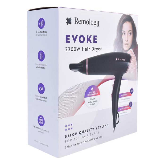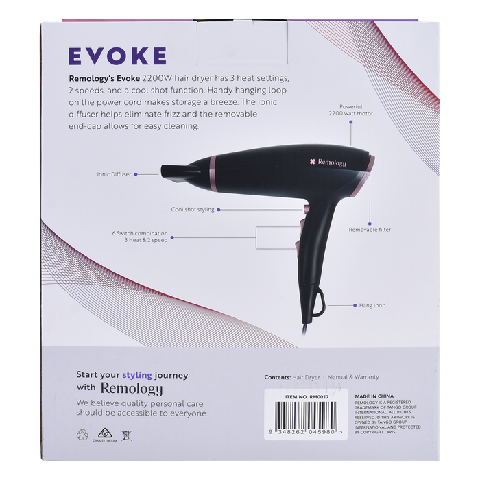 Powerful 2000 watt full-sized hair dryer. 3 heat settings, 2 speeds as well as cool shot function to set your style. Handy hanging loop on power cord. Removable end-cap and ionic diffuser to eliminate frizz. Unplug after use. Do not immerse in water. Wipe clean with damp cloth if necessary. Make sure appliance is totally cool before storage. Do not wrap the power cord around appliance when storing. Do not use any electrical styling appliance in or near bathtubs, showers, basins or other vessels containing water. Children should use under adult supervision only.