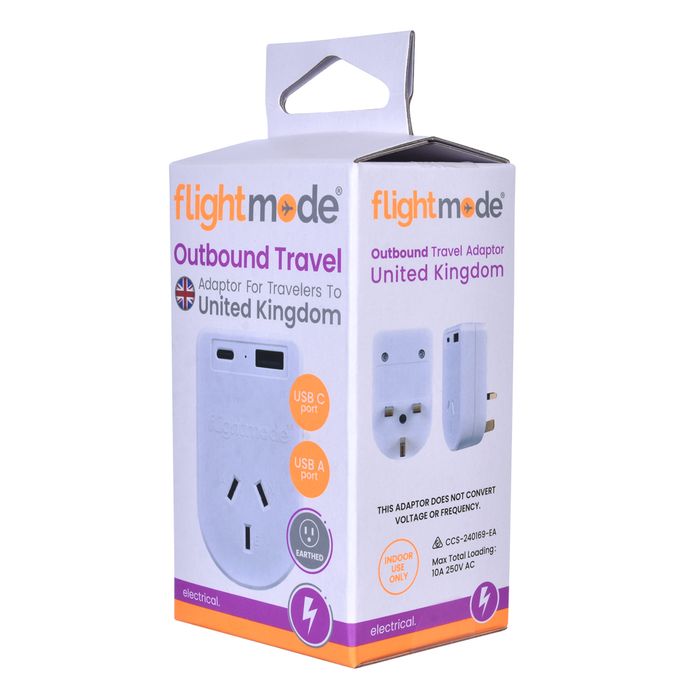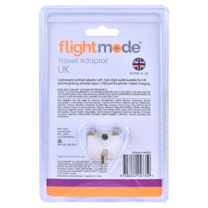 Lightweight earthed adaptor with 3 pin style outlet suitable for UK and Hong Kong. Includes type C USB port for phone / tablet charging. Loading: 10A 110V-240V. Please note, does not convert voltage or frequency.