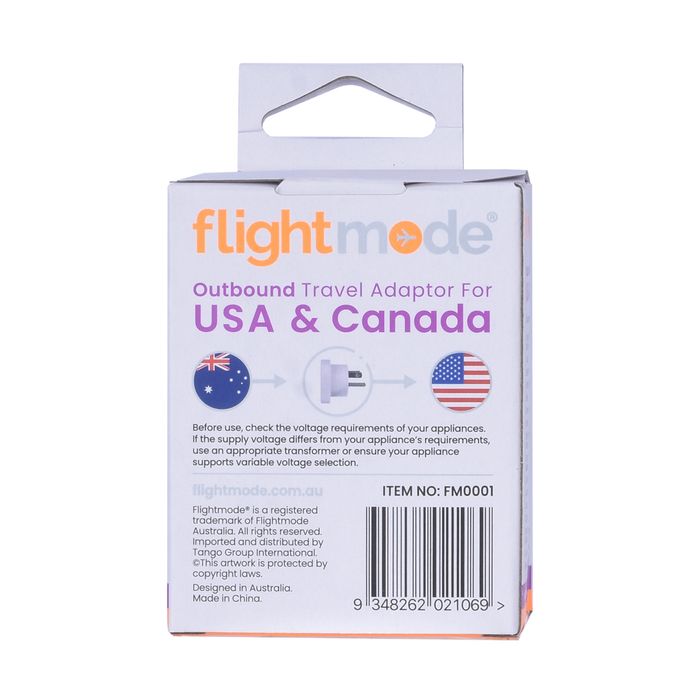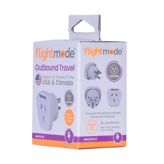 Allows Australian plugs to be used in countries that use USA 3 pin style outlets. Earthed. Max loading: 10A Adaptors do not convert voltage or frequency - please check the supply voltage and frequency and the voltage and frequency required to operate your appliance. If either of these differ, an appropriate transformer must be used. Size: Material: Colours: White Packaging: