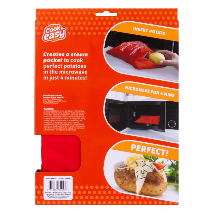 Great for: -All types of potatoes -Corn on the cob -Day-Old bread -Tortillas How it works? Creates a steam pocket to cook perfect potatoes in the microwave in just 4 minutes! -Cooks all types of potatoes - white, red, yams and more! -Delicious, steamy perfect results. -Washable and reusable! Contains all New Material. Shell Fabric: 100% Polyester Lining: 80% Polyester, 20% Cotton Polyfill: 100% Polyester Specifications: Color: Red Package weight:0.125kg Package dimensions:22*2*30cm