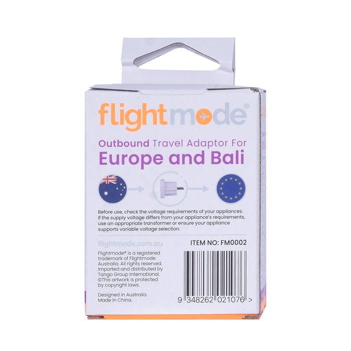 Allows Australian plugs to be used in countries that use the European 2 pin style outlet. Earthed. Max loading: 10A Adaptors do not convert voltage or frequency - please check the supply voltage and frequency and the voltage and frequency required to operate your appliance. If either of these differ, an appropriate transformer must be used. Size: Material: Colours: White.