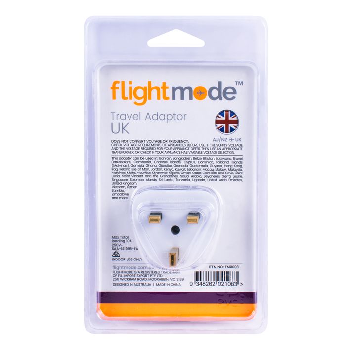 Allows Australian plugs to be used in countries that use the UK/Hong Kong 3 pin style outlet. Earthed. Max loading: 10A Adaptors do not convert voltage or frequency - please check the supply voltage and frequency and the voltage and frequency required to operate your appliance. If either of these differ, an appropriate transformer must be used. Size: Material: Colours: White Packaging: