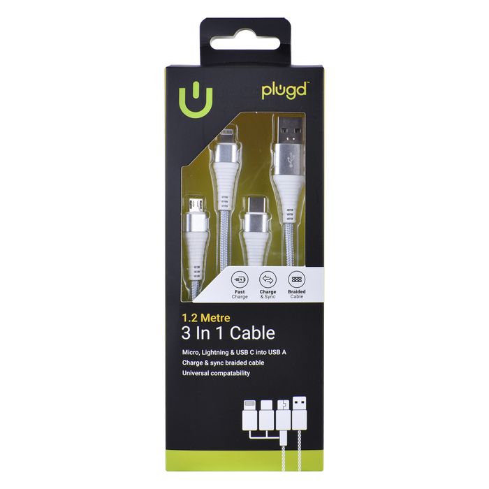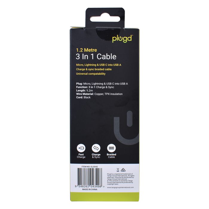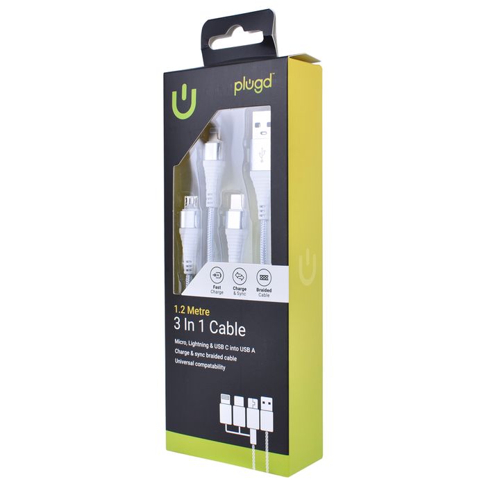 3-IN-1 CHARGE & SYNC CABEL - MICRO, IPHONE AND TYPE C INTO USB A