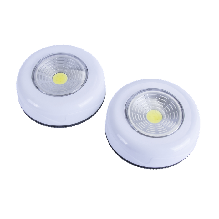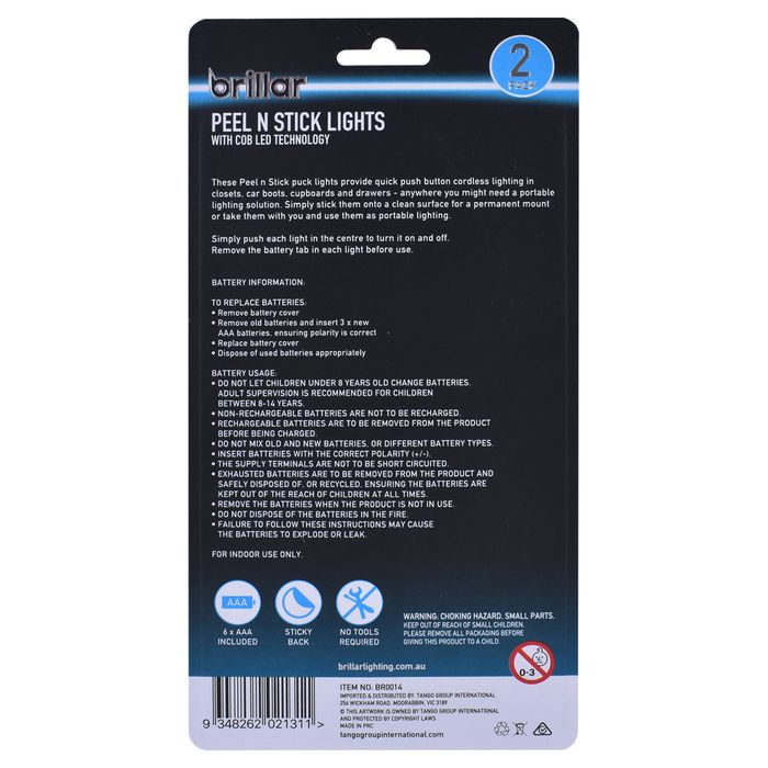 These Peel N Stick puck lights provide quick push button cordless lighting closets, car boots, cupboards and drawers. Anywhere you might need a portable lighting solution. Simply stick them onto a clean surface for a permanent mount or use them take them with you and use them as portable lighting. Remove the battery tab in the lights before use. • 2 pack • Easy to install • Requires 3 x AAA batteries (included) in each light
