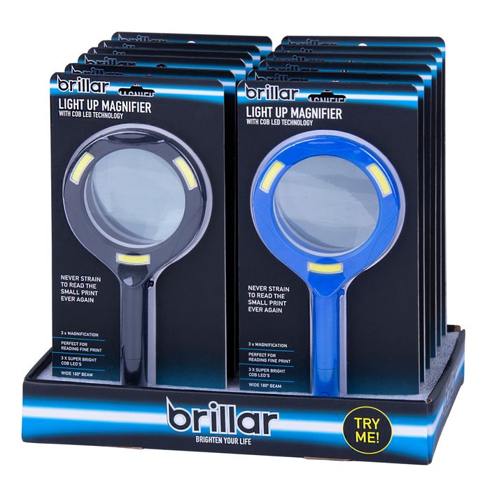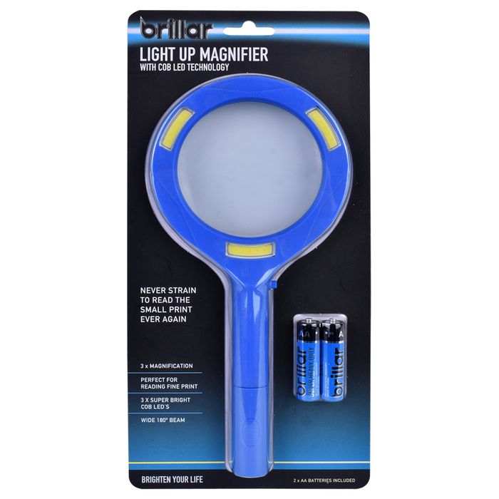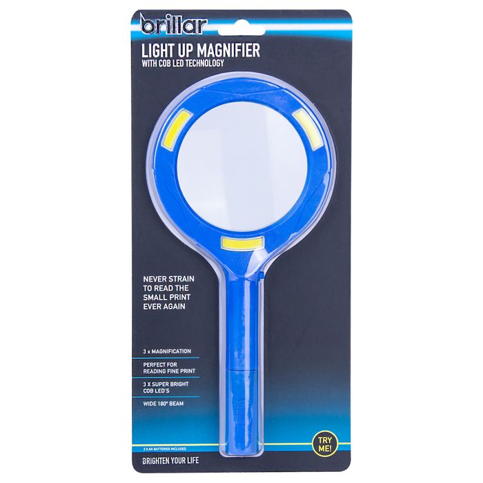 Read all the fine print with this Light Up Magnifier. With 3 x magnification and 3 COB LEDs to illuminate the reading area with bright, even light. Take it with you to read maps, menus or prescriptions and medication fine print and enjoy the confidence of knowing you don't need to strain to read the small print again. • 3 x magnification • 3 x super bright COB LEDs • Wide 180 degree beam • Requires 2 x AA batteries (included) • Try me function