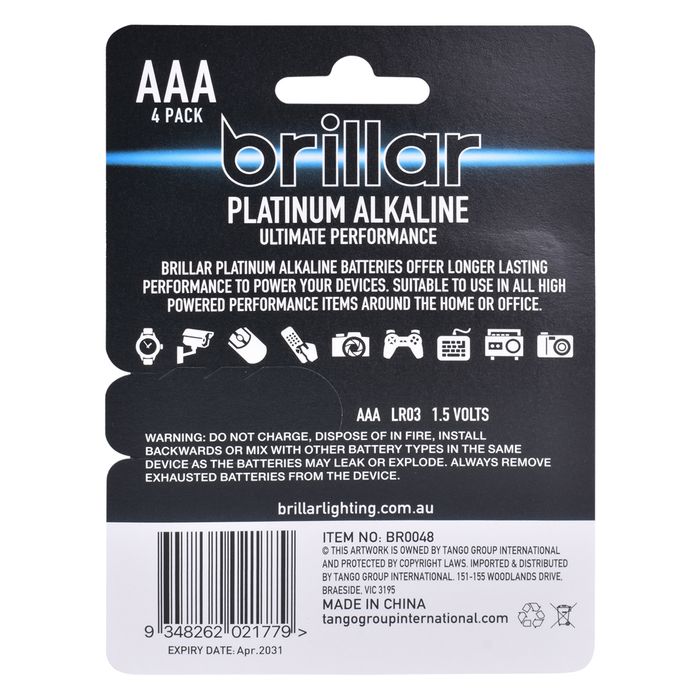 Brillar platinum alkaline batteries offer longer lasting performance to power your devices. Suitable to use in all high powered performance items around the home or office. • AAA LR03 1.5 volts • Mercury and Cadmium free • 4 pack