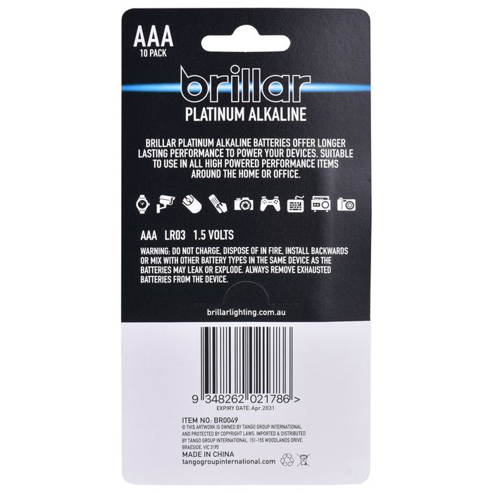 Brillar platinum alkaline batteries offer longer lasting performance to power your devices. Suitable to use in all high powered performance items around the home or office. • AAA LR03 1.5 volts • Mercury and Cadmium free • 10 pack