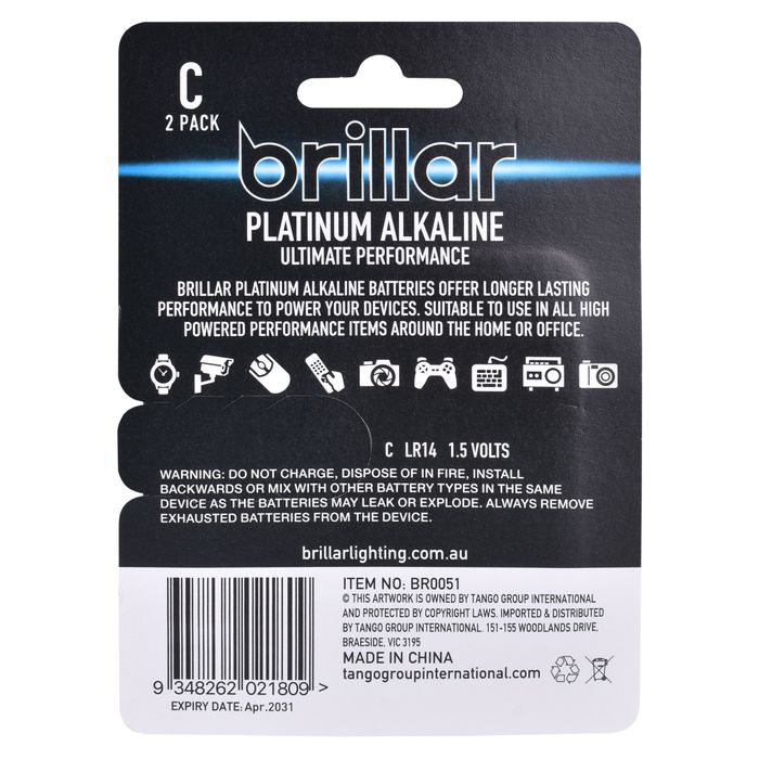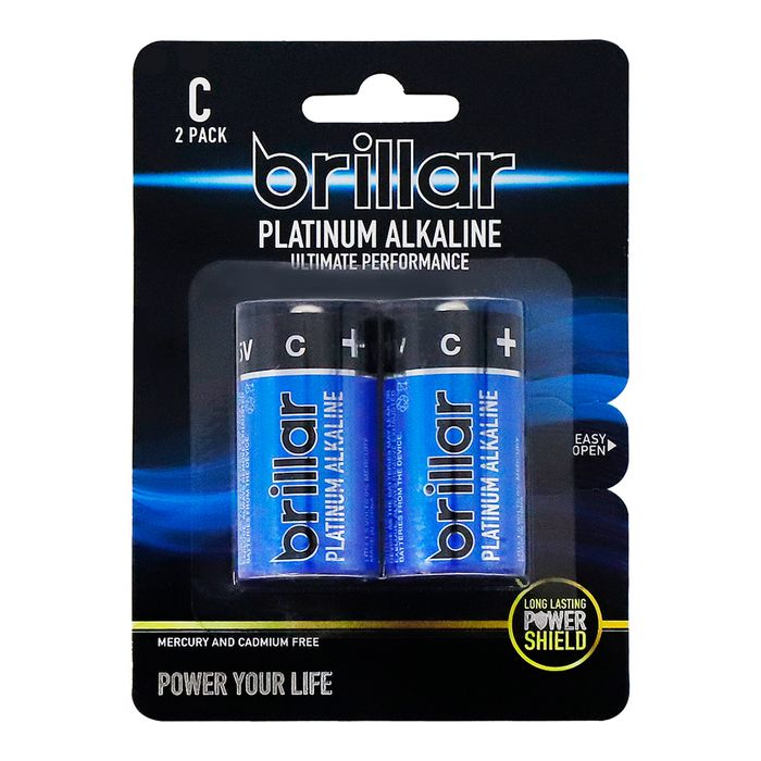 Brillar platinum alkaline batteries offer longer lasting performance to power your devices. Suitable to use in all high-powered performance items around the home or office. • C LR14 1.5 Volts • Mercury and Cadmium free • 2 pack