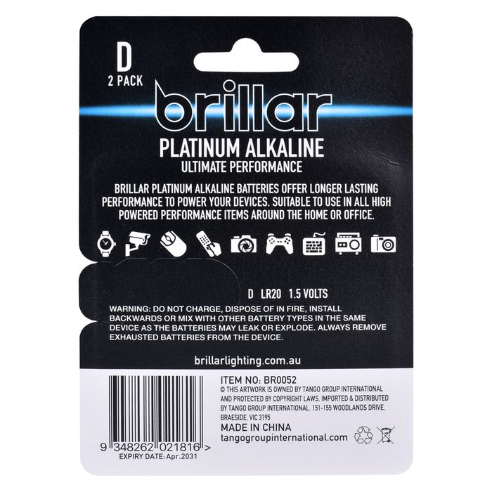 BR0052 Brillar platinum alkaline batteries offer longer lasting performance to power your devices. Suitable to use in all high powered performance items around the home or office. • D LR20 1.5 Volts • Mercury and Cadmium free • 2 pack