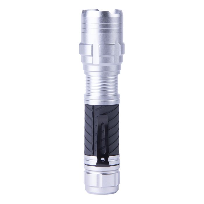 300 lumens 3 light modes Push/pull focussing beam IPX4 weather and impact resistant Tactical grade aluminium casing with soft rubber grip Sturdy metal belt clip Requires 3 x AAA batteries (included)