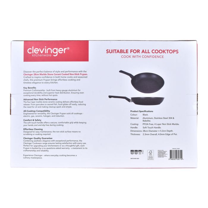 Features - Heavy guage forged aluminium body - PFOA free - 4 layer non-stick marble coating for durability & superior food release - Suitable for all cooktop types - Ergonomic wooden look soft touch handle - Size is 28 x 5.5cm depth / 2.7mm bottom / 4.0mm oral The Clevinger range has been hand selected to provide a complete category solution in non-stick cookware. We have several price points considered and bring all the newest technologies to the market in our range. All Clevinger cookware products are constructed using quality materials and workmanship, and our functionality is second to none. Our range is suitable for all cooktop types including, electric, gas, ceramic, halogen and induction. All Clevinger cookware is dishwasher safe meaning no soaking required, so not only will your cooking be top class and your food less likely to burn, you’ll also save time not having to do the dishes after each meal. It’s a win-win scenario, really!