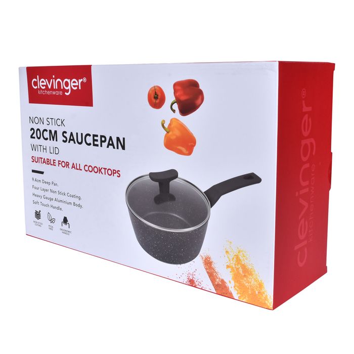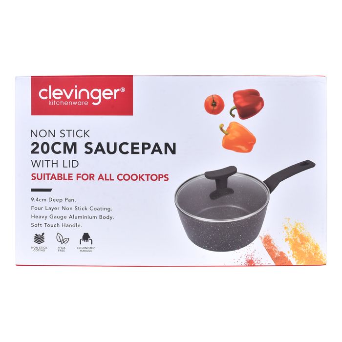Features - Heavy guage forged aluminium body - PFOA free - 4 layer non-stick marble coating for durability & superior food release - Suitable for all cooktop types - Ergonomic wooden look soft touch handle - Size is 20 x 9cm depth (plus lid) / 2.7mm bottom / 4.0mm or The Clevinger range has been hand selected to provide a complete category solution in non-stick cookware. We have several price points considered and bring all the newest technologies to the market in our range. All Clevinger cookware products are constructed using quality materials and workmanship, and our functionality is second to none. Our range is suitable for all cooktop types including, electric, gas, ceramic, halogen and induction. All Clevinger cookware is dishwasher safe meaning no soaking required, so not only will your cooking be top class and your food less likely to burn, you’ll also save time not having to do the dishes after each meal. It’s a win-win scenario, really!