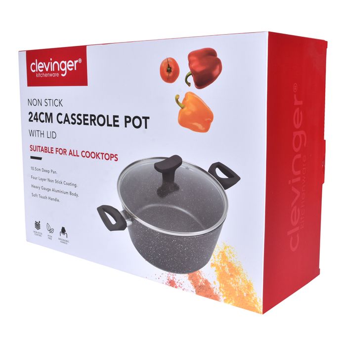 Features - Heavy guage forged aluminium body - PFOA free - 4 layer non-stick marble coating for durability & superior food release - Suitable for all cooktop types - Ergonomic wooden look soft touch handle - Size is 24 x 10.5cm depth / 2.7mm bottom / 4.0mm oral The Clevinger range has been hand selected to provide a complete category solution in non-stick cookware. We have several price points considered and bring all the newest technologies to the market in our range. All Clevinger cookware products are constructed using quality materials and workmanship, and our functionality is second to none. Our range is suitable for all cooktop types including, electric, gas, ceramic, halogen and induction. All Clevinger cookware is dishwasher safe meaning no soaking required, so not only will your cooking be top class and your food less likely to burn, you’ll also save time not having to do the dishes after each meal. It’s a win-win scenario, really!