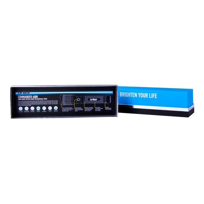 4000 Lumens 3 light modes Up to 20 hour runtime IPX4 weather and impact resistant Tactical grade aluminium casing USB rechargeable 5000 mAh lithium ion battery Can be used as a powerbank Adjustable focus beam Dimensions: 55 x 55 x 265mm
