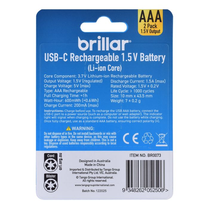 2PK AAA USB RECHARGEABLE LI-ION BATTERY