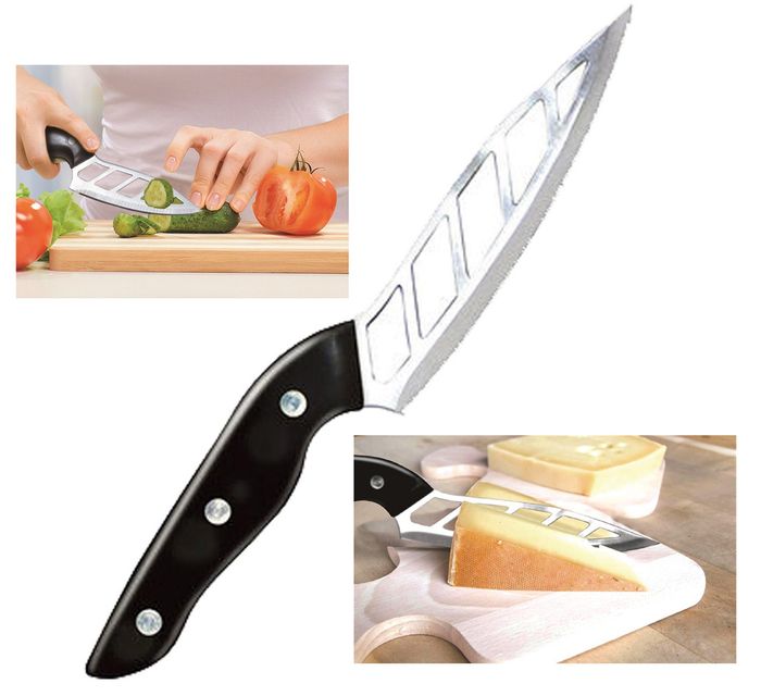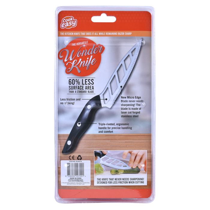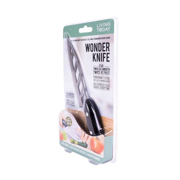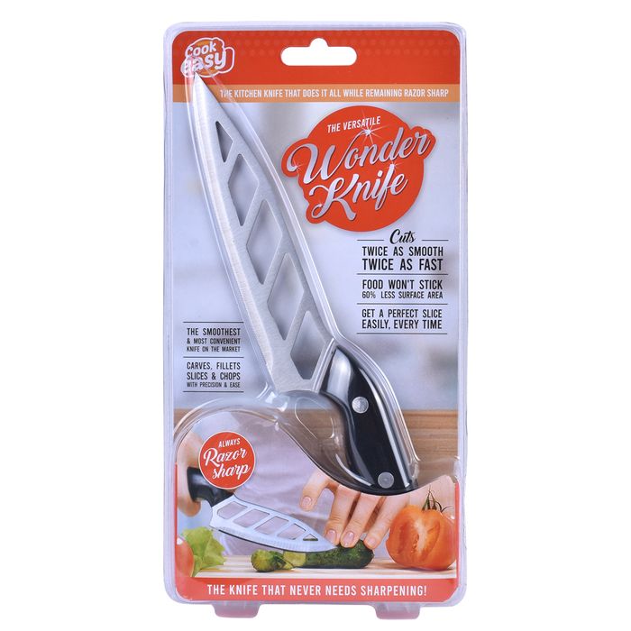 Wonder Knife Makes Smooth, Clean Cuts Without Food Sticking, Every Time! Tired of struggling with dull knives that barely even work? Introducing the As Seen On TV Wonder Knife, the greatest innovation in slicing bread, since sliced bread! This versatile kitchen knife is designed to do it all, and is guaranteed to stay razor sharp for life! The secret is the aerodynamic design that creates less friction when you slice, so foods don't stick for perfect, clean cuts every time! This makes the Wonder Knife the easiest and smoothest cutting knife in your kitchen drawer. The amazing Wonder Knife carves, filets, slices and chops with ease, better than any other specialty knife. It even cuts through fresh soft bread! The Aero Knife is so universal and easy to use - great for so many different things. The Wonder Knife will be the only cooking knife you will ever want to use! Features & Benefits Food never sticks to the Wonder Knife. Super touch and sharp, Wonder Knife is made of laser cut forged stainless steel. Now cutting and slicing any food is easier and cleaner than ever. Wonder Knife holes gives it 60% less surface area than an ordinary knife. Wonder Knife is light as air and easy to handle. What is the length of the Wonder Knife? Wonder Knife measures 10 inches in length with a 6 inch blade. How should I clean my Wonder Knife? We recommend that you wash and dry the Wonder Knife immediately after use. Prolonged exposure to acidic substances (i.e. tomato and lemon) can damage even the most high quality knives over time. While you can clean your Wonder Knife in the dishwasher, we recommend that you hand wash and dry this product in order to prevent banging damage to the blade, and to retain the lustre of the product for its full life. Specifications: Material: stainless steel + ABS Product dimensions: 16*3.5*26.7cm Product weight: 0.101KG