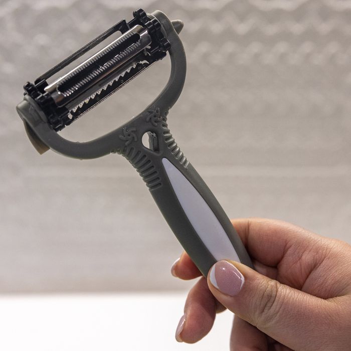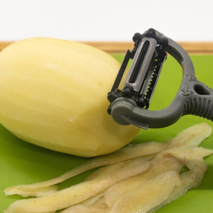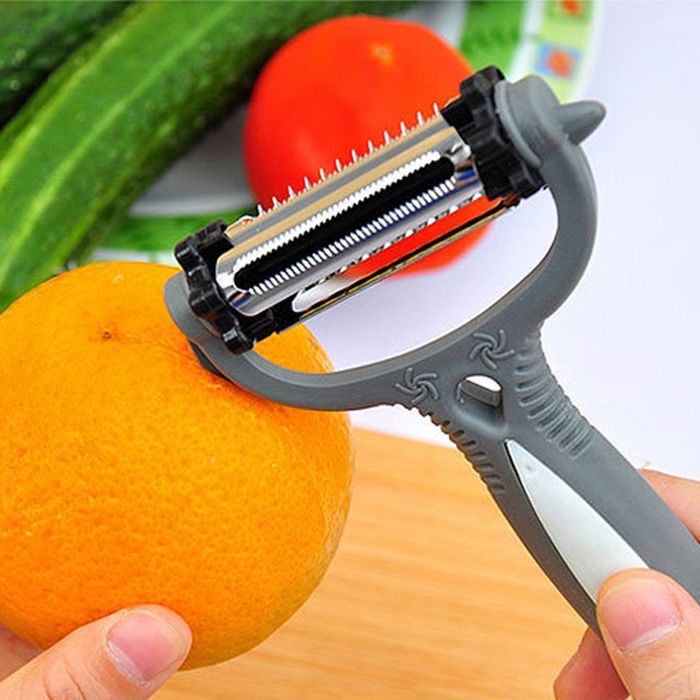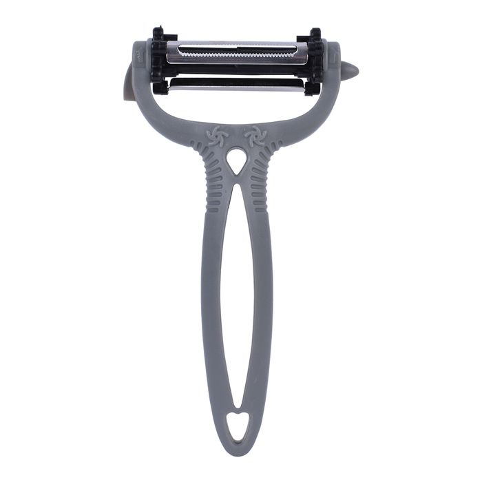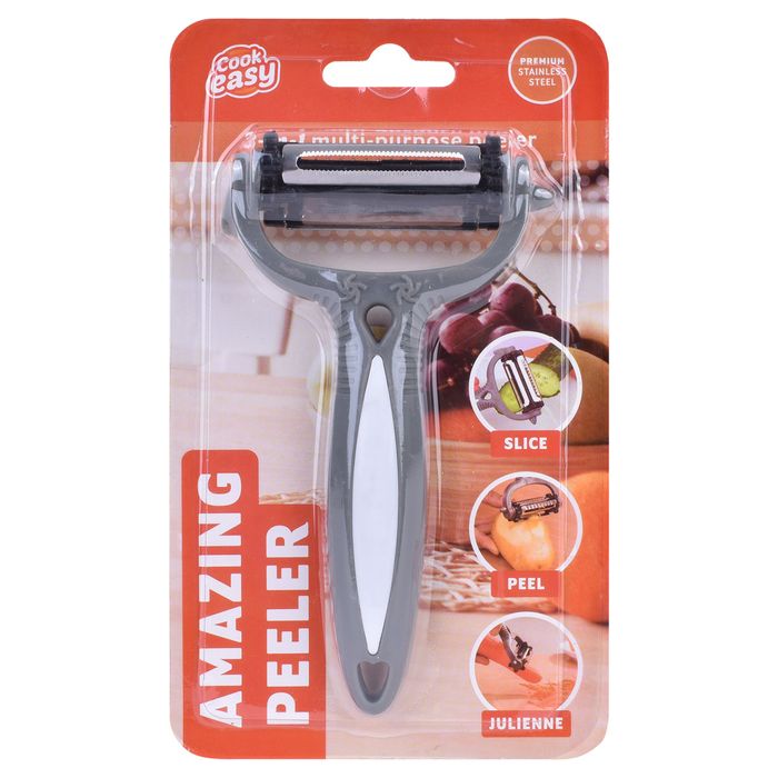 Make eating healthy and fresh foods easy with the AMAZING PEELER Shave, slice, and peel vegetables and fruits with the rotary selector. Click for the corresponding blade to achieve the desired cut. The power blade slices carrots and potatoes. The precision blade shaves delicate soft items like fruit and tomatoes and makes less waste. The julienne blade thinly sliced vegetables like zucchini and make vegetable noodles. As the blades work in both directions, the AMAZING PEELER cuts prep time in half. Slice hard cheese or soft cheese. Shave chocolate or parmesan. Set it down and use it like a mandolin. The AMAZING PEELER does the job of three tools. Save your kitchen drawer space and simplify prep time. Features: • Save time money and space • Amazing 3 in 1 Blade – Just Click and Peel • Curved blade construction cuts larger surface area • Click it to switch it • Razor sharp versatile blade • Ergonomic handle • Cleans with ease: dishwasher safe • As Seen on TV Specifications: Colour: grey Material: plastic+ SS Package dimensions: 11.8*2.4*20cm Package weight:0.053kg